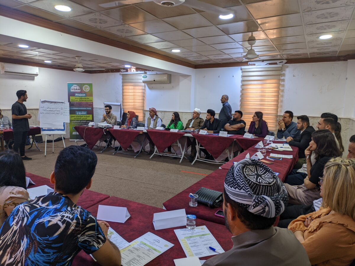 The Joint Initiative for Strategic Religious Action (JISRA) in Iraq is a consortium of three international NGOs, namely Search for Common Ground (Search), Tearfund, and Mensen met een Missie (MM), as well as three Iraqi partners; Peace and Freedom Organisation (PFO), INSAN Society, and Women Empowerment Organization (WEO). JISRA’s ultimate goal is peaceful and just societies where all enjoy peaceful coexistence. JISRA leverages the role of a variety of actors, including religious leaders, young women and men from different religious and socio-economic backgrounds and civil society to identify, reflect, and build upon specific entry points for intrareligious, interreligious, and extra-religious engagement and promote an inclusive, tolerant, and flourishing society in Iraq.